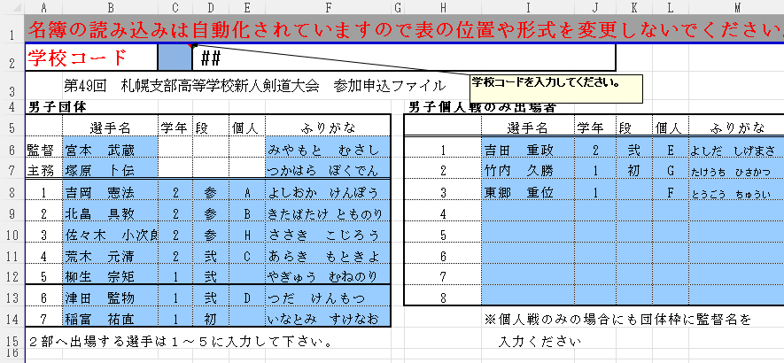 高体連札幌支部剣道専門部がかかわる大会は、春季大会、国体予選会、地区大会、新人戦の4つがあります。また、地区大会を除く3つの大会(春季大会・国体予選・新人戦)に用いる入力ファイル(メールに添付するエクセルファイル)は、基本的にはほぼ同じファイルを用います。